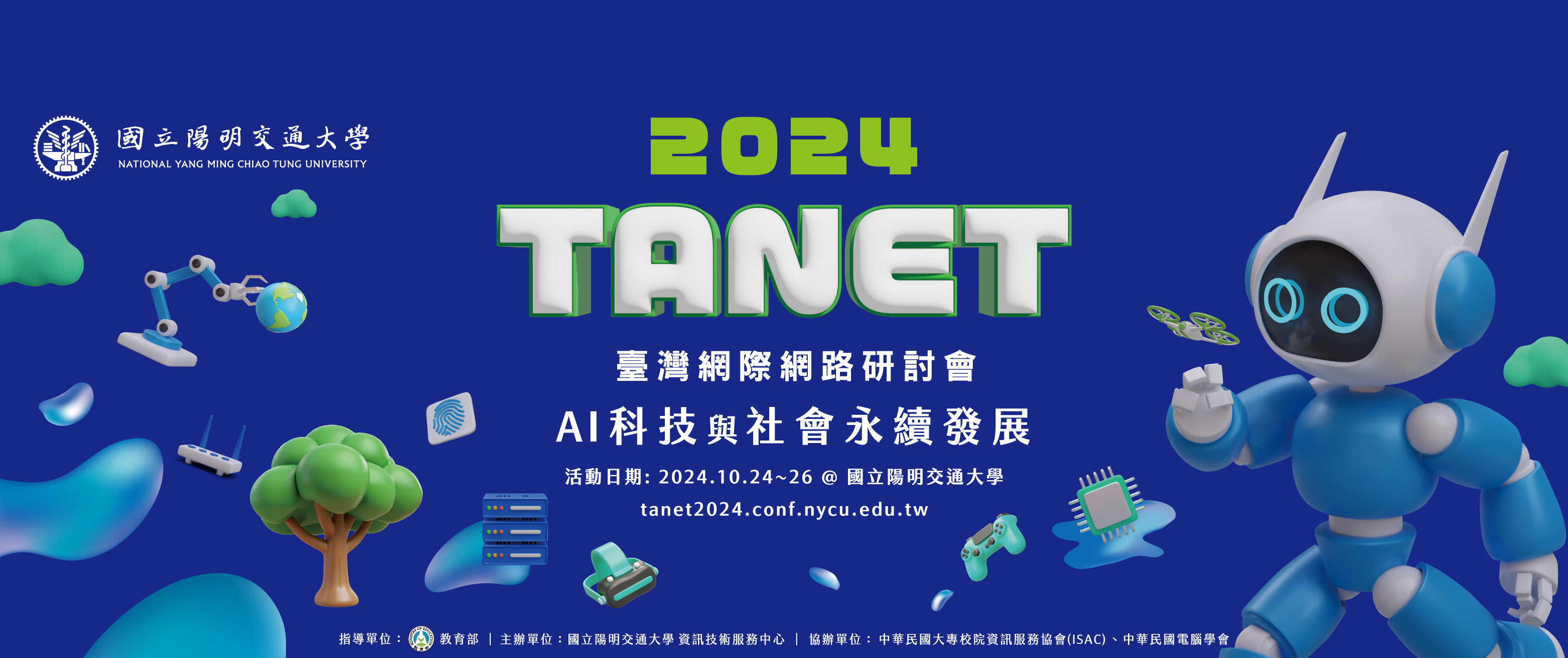 2024 台灣網際網路研討會 (Taiwan Academic Network Conference, TANET) 謹訂於2024年10月24日至2024年10月26日假國立陽明交通大學陽明校區活動中心舉行。本屆大會主題為「AI科技與社會永續發展」,我們將探討如何通過結合網路技術、資訊安全和生成式AI等先進技術,來實現永續發展目標,並且建立數位韌性,以應對未來的挑戰,以及跨域合作在這一過程中的關鍵作用。